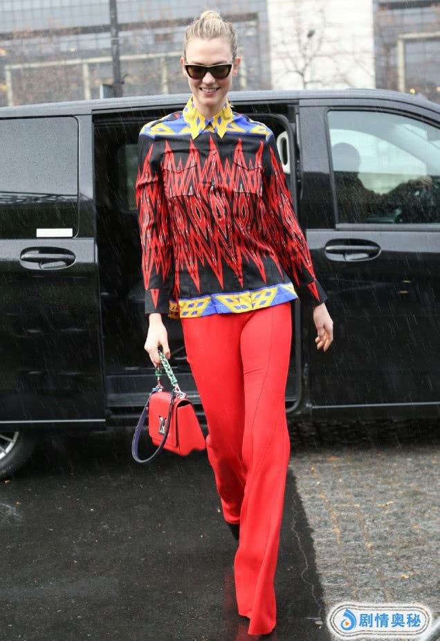 Karlie Kloss还有这样的打扮,她穿了一套红色的衣服,上面是有很多条纹的装饰,看上去就很特别,她拿着一个黑色手拿包,这样看上去也很潮流,红色还很显白,看上去她的皮肤真的超级好。