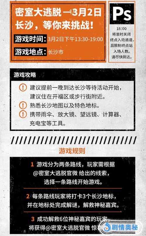 《密室大逃脱》线下活动分成了两条路线,都正街路线与世界之窗路线,每条路线打卡长沙的三个地标,破解节目组设置的谜题,再与官微互动获得线索,最终通关游戏营救明星。“出发地点玩家太多了。”柿子感叹。她们一行一共三个人,由于天气与地点,她们原以为参与活动的玩家并不会太多,但实际达到出发点时,玩家已经形成了人海。始发站在清香亭附近的一家火锅店,节目组将店铺设置成一个观察场景,但真正的线索藏在与《密室大逃脱》官博的互动中,在店铺通线索拿到卡片,再解除卡片上的谜题才能获得第一站的地点。