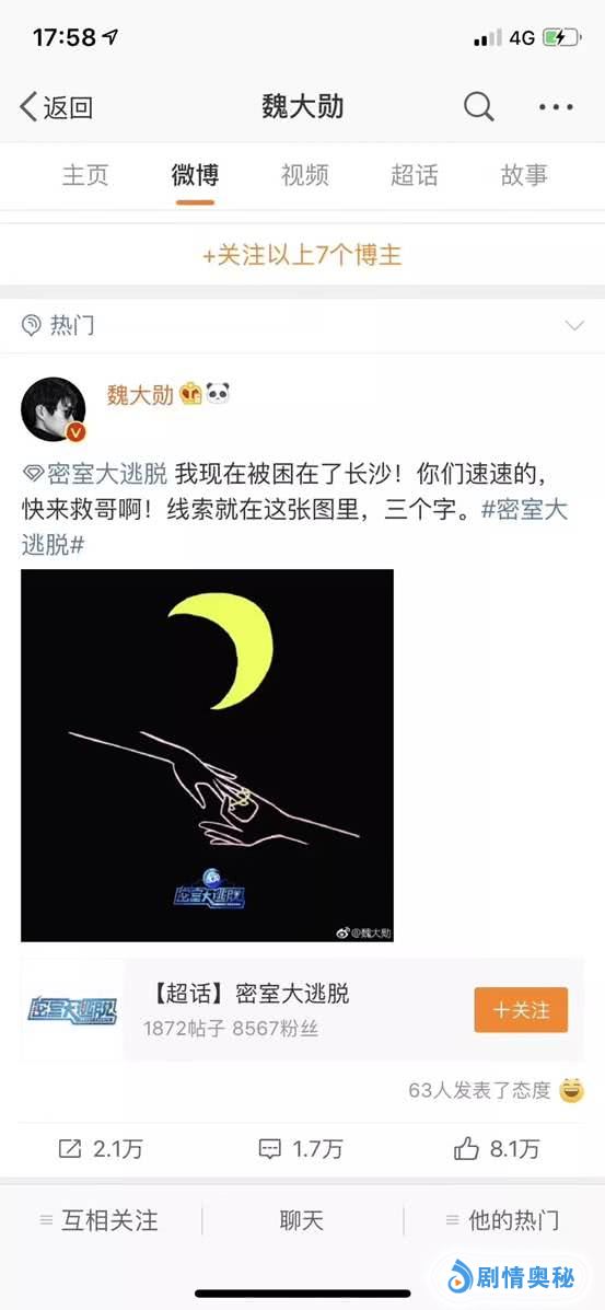 但实际上随着明星以线下出现或者线上发博等形式参与营救活动,《密室大逃脱》的传播量与活动热度迅速增加,粉丝玩家在现实中感受到了参与感与体验感,#约等于和魏大勋结婚了##密室大逃脱#等相关话题迅速登上微博热搜。