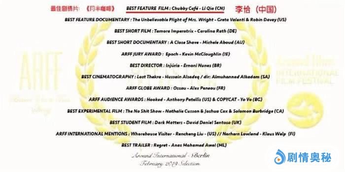 据悉《月半咖啡》(Chubby Café)除了本次荣获ARFF环球国际电影节大奖,还当选了美国加州举办的DMOFF全球每月优秀电影(Direct Monthly Online Film Festival)的“最佳剧情片”,正在入围并角逐美国纽约举办的Aphrodite 全球电影大奖(Aphrodite Film Awards)。