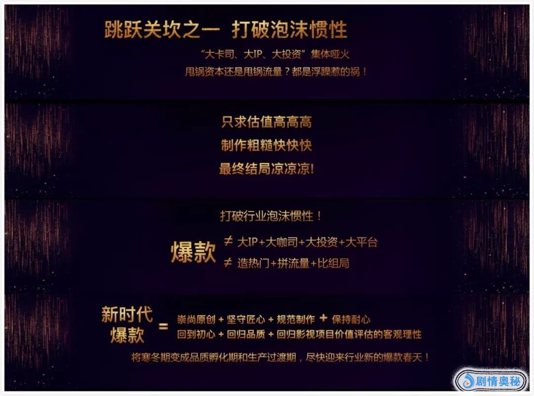 2019年,我们必须打破行业泡沫惯性和投机心理,如今要成为一个爆款,绝不是造热门、拼流量、拼组局,爆款也不是“大IP+大咖司+大投资+大平台”。