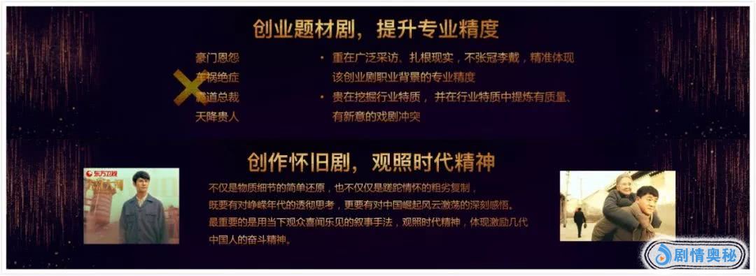 首先自觉远离豪门恩怨、车祸绝症、霸道总裁、天降贵人四大创业剧悬浮雷区。重在广泛采访、扎根现实,不张冠李戴,精准体现该创业剧职业背景的专业精度;贵在挖掘行业特质, 并在行业特质中提炼有质量、有新意的戏剧冲突。