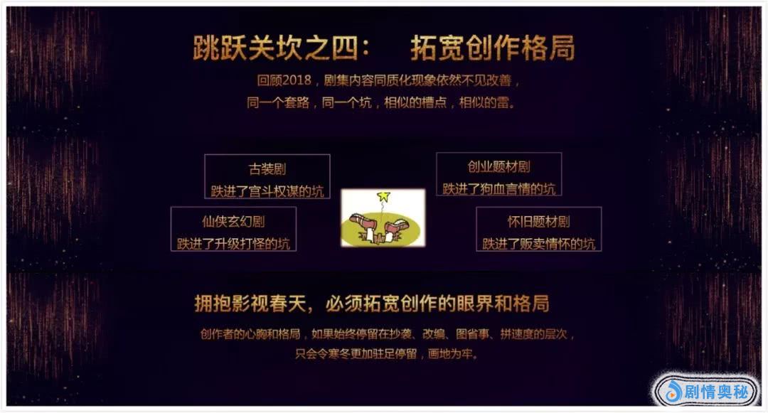 2019,我们呼吁,理性的制作公司抓紧调转船头,将目标从“头部”转向“腰部”! 希望生产更多的中低成本剧,重点开发新家庭剧、情景喜剧、“青春剧+X”。