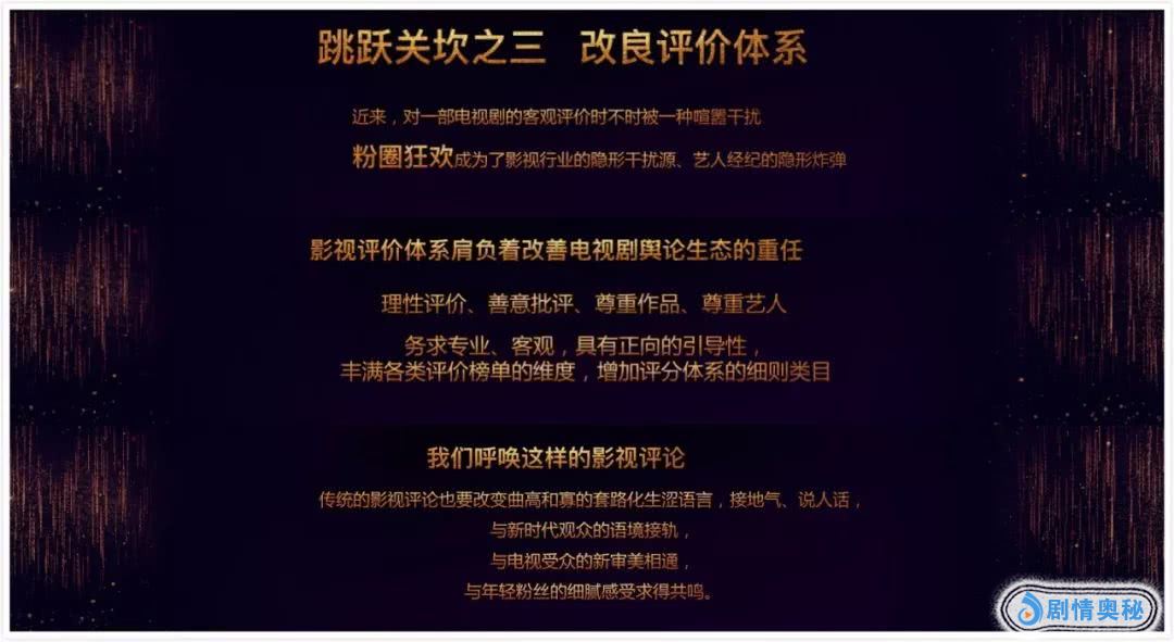 影视评价体系肩负着改善电视剧舆论生态的重任。对于影视评论应该提倡理性评价、善意批评、尊重作品、尊重艺人;同时务求专业、客观,具有正向的引导性,丰满各类评价榜单的维度,增加评分体系的细则类目。