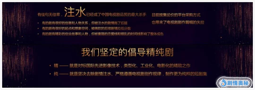 因此,我们坚定地倡导精纯剧。所谓的“精”,就是对标国际先进影像技术,类型化、工业化、电影化的精致之作;“纯”,就是去除注水、更为纯粹的短剧集。