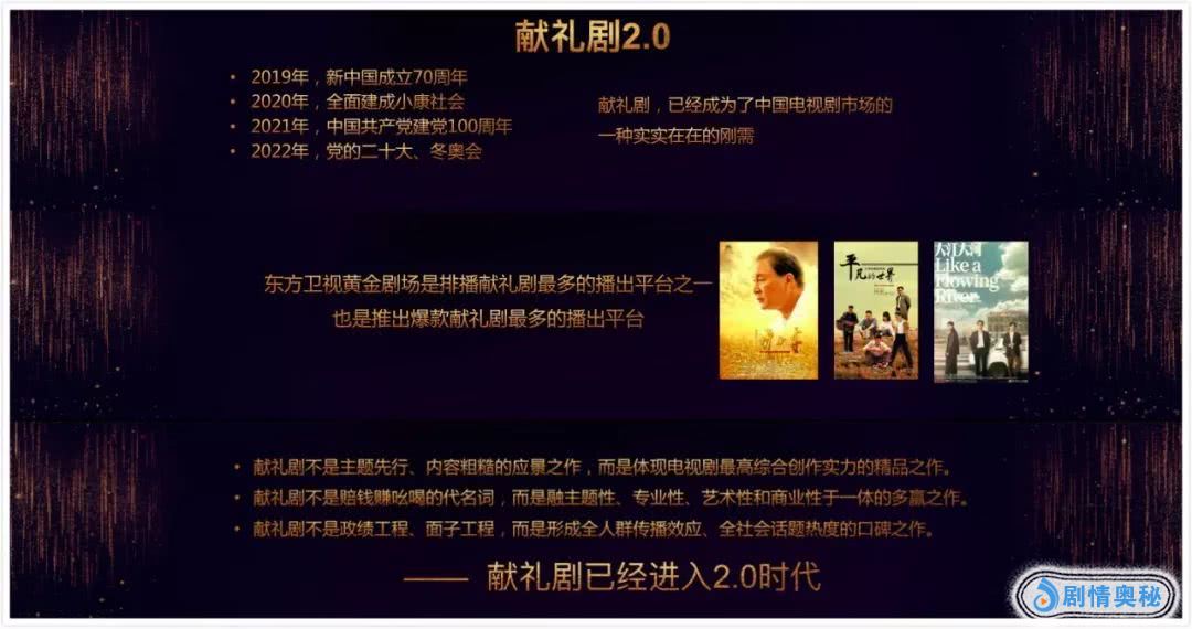 如今,献礼剧不是主题先行、内容粗糙的应景之作,而是体现电视剧最高综合创作实力的精品之作;献礼剧不是赔钱赚吆喝的代名词,而是融主题性、专业性、艺术性和商业性于一体的多赢之作;献礼剧不是政绩工程、面子工程,而是形成全人群传播效应、全社会话题热度的口碑之作。献礼剧已经进入2.0时代。