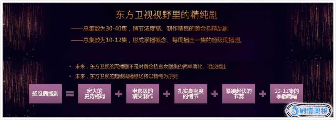 东方卫视视野里的精纯剧,包括总集数为30-40集,情节浓度高、制作精良的黄金档精品剧;还包括了总集数为10-12集,形成季播概念、每周播出一集的超级周播剧。