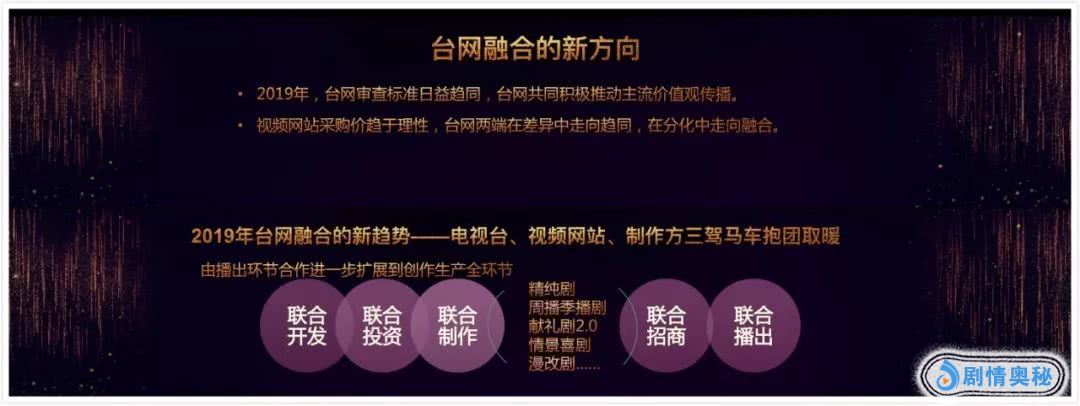 2019年,台网审查标准日益趋同,台网共同积极推动主流价值观传播。视频网站采购价趋于理性,台网两端在差异中走向趋同,在分化中走向融合。电视台、视频网站、制作方三驾马车抱团取暖,由播出环节合作进一步扩展到创作生产全环节,希望台网联合开发项目、联合投资、联合制作、联合招商、联合播出精纯剧、周播季播剧、献礼剧2.0、情景喜剧……成为可能的模式。
