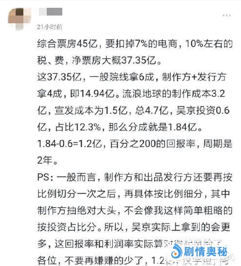 《流浪地球》国内的票房收入是45.42亿,电影的收益大概到2.7亿到2.8亿之间。有网友通过换算,大致算出了吴京在这部电影中可以拿到的分成,大约是1.2亿左右。不少网友表示“这么少?“我们都知道吴京为电影付出很多,不仅从特邀出演变成主演,而且还不收报酬,最后还掏出6000万投资。