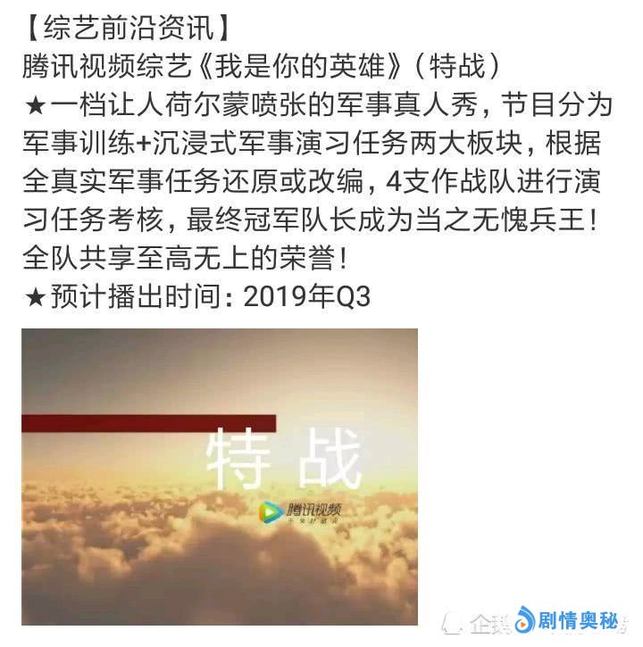 但其实这档节目的主旨还是在于选秀,而由腾讯打造的另一档新综艺《我是你的英雄》,则是真正的进入到部队去与他们共同体验生活。这档节目现已更名为《特战》,暂定在2019年第三季度上线播出。