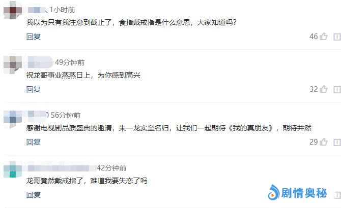 有粉丝评论道:我以为只有我注意到戒指了,食指戴戒指是什么意思,大家知道吗?有粉丝评论道:祝龙哥事业蒸蒸日上,为你感到高兴。有粉丝评论道:感谢电视剧品质盛典的邀请,朱一龙实至名归,让我们一起期待《我的真朋友》,期待井然!还有粉丝疑惑道:龙哥竟然戴戒指了,难道我要失恋了吗?那么问题来了,男孩子食指戴戒指代表什么呢?