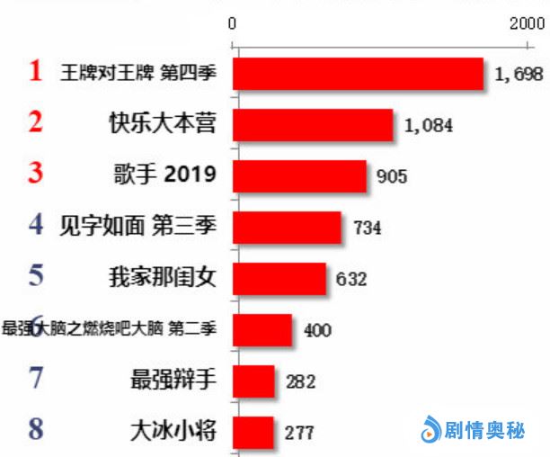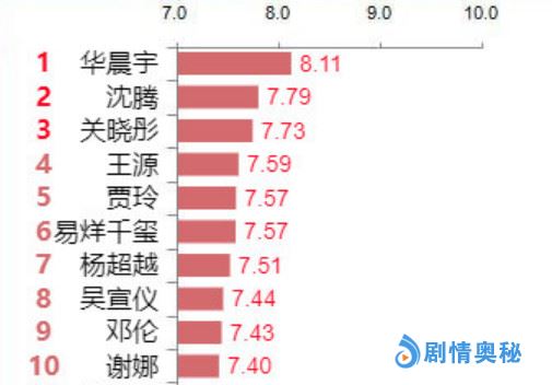 这是目前人气评分最高的10位综艺嘉宾,位列前五的五位综艺嘉宾依次是“花花”华晨宇、沈腾、关晓彤、TFBOYS王源,以及贾玲,其中难寻敌手的实力派唱将华晨宇破8,除了挺进前四的TFBOYS王源以外,前五名中其余四位综艺嘉宾全部是综艺节目《王牌对王牌》第二季的常驻嘉宾,难怪该综艺的人气高居不下。