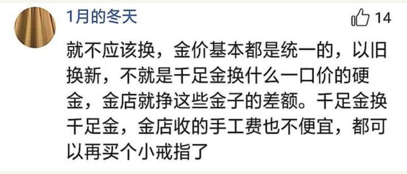 胡女士的儿子,吴先生表示对珠宝店依旧换新的活动深深地质疑。他表示交换的东西和自己的东西不等值,也不等价。为此事,多次上门要求店家处理,但次次碰壁。而珠宝店方表示,是吴女士自愿更换,且金饰的价值不是用重量决定的。据了解,吴女士的旧耳环是千足金,而换新的耳环是916金。