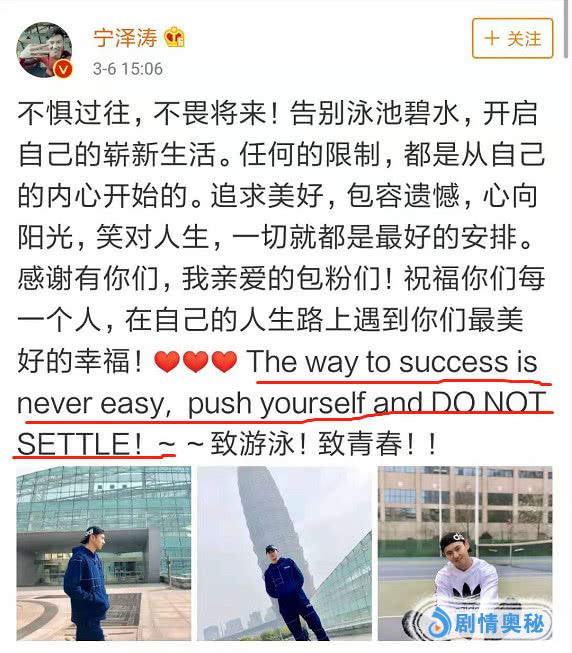 宁泽涛在文中还先后感谢了喜欢自己的粉丝,并向粉丝朋友们送上诚挚祝福。在文末,宁泽涛则用一句英文勉励自己,也致敬泳坛:“The way to success is never easy, push yourself and DO NOT SETTLE!”