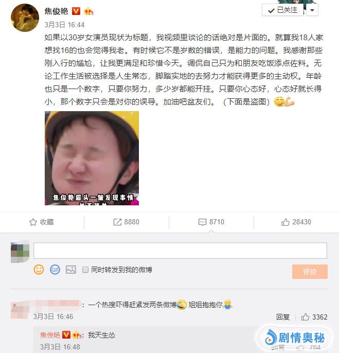 对此焦俊艳也是在个人的社交平台上连发两条信息告诉大家只要自己努力不管什么年纪都能“开挂”,并且在评论区中还主动承认自己“天生认怂”,这一点实在是博得了不少人都喜爱,在最近的电视剧品质盛典的红毯上焦俊艳也是带妆出席,并被调侃这次有化妆费了,像这种人设性格大家都喜爱,自然是讨厌不到哪里去。