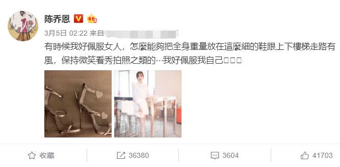 连她自己都忍不住要发微博感叹,“有时候我好佩服女人,怎么能够把全身重量放在这么细的鞋跟上下楼梯走路有风,保持微笑看秀拍照之类的,我好佩服我自己”。