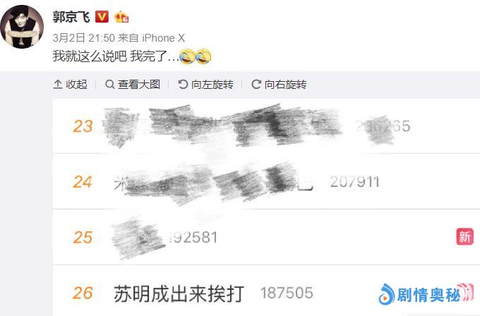 在《都挺好》开播前,郭京飞就开始提前给观众打“预防针”,他在微博表示:“《都挺好》马上要播了,为苏明成感到了一丝不安”;开播后,话题榜“苏明成出来挨打”上热搜,郭京飞自嘲道:“我就这么说吧,我完了…”以自嘲来“自卫”,是演员普遍采取的心理防御姿势之一。