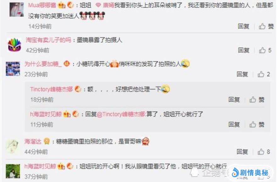 不过这是不是拍照片的人技术不过关呢,不过小伙伴们猜到了相机在谁的手里了么,相信很多的小伙伴们都知道吧,虽然他全程没有出现在照片里,但人家的存在感是不可能忽视的还是有一些小伙伴发现了他。通过墨镜的上的影子大家发现这人就是罗先生。可谓是两个人相当甜蜜。
