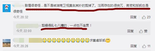不仅如此高蜜和邹凯戏份少就算了,还被湖南卫视的剪辑师乱剪辑。汪雨存在的很突兀,高蜜和邹凯的剧情一点都不连贯,如果不是原著党看了小说都不知道高蜜和邹凯两人的剧情发展,很多网友本以为邹凯追妻起码要10集但现在看来最多2集,网友们都希望能够看到高蜜多虐虐邹凯,毕竟小说中“邹凯追妻”的剧情才是最具有亮点,如今全都被删掉了,原著党都想给《逆流而上的你》的编剧寄刀片了。