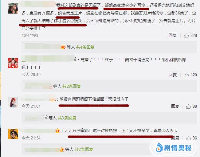 高蜜邹凯两人离婚,全国人民都发来贺电。但是《逆流而上的你》即将要大结局了,还有六集的剧情,网友们都期待邹凯如何追妻。可是《逆流而上的你》的正片高蜜和邹凯的戏份少得可怜,但是官微却总拿着高蜜邹凯两人上热搜引起了不少网友不满,网友们都吐槽预告就是正片,高蜜和邹凯两人戏份还没有杨光她妈和刘艾她妈多,更没有齐楠多。虽然高蜜和邹凯不是主角,但是他们戏份还没男三女三的多,反观金瀚和赵丽颖的《倾城时光》女二男二的戏份比男女主还要多,同样是现代剧差距怎么这么大啊。