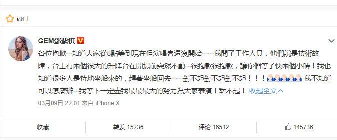 而且在舞台上,邓紫棋竟90度鞠躬道歉,看的出来非常有诚意了,而且这次的原因却是太现实没有办法,主要演唱会之前检查都没有问题,临时演唱才出现问题,修复了很久,她自己也很着急,其实不管是邓紫棋的人品还是说歌曲,都是非常走心的,希望大家关注作品。