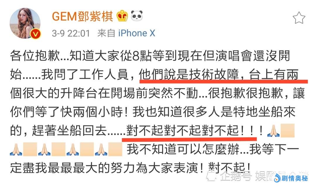 因为不明真相的设备故障,演唱会开场两个小时之后,依然没有开唱。邓紫棋不断的发文安抚粉丝,向各个社交媒体上的粉丝、歌迷道歉。为了表达歉意,还即兴创作了一首钢琴曲送给听众。这种主办方不够专业,却要艺人背锅的做法,着实替艺人觉得冤。