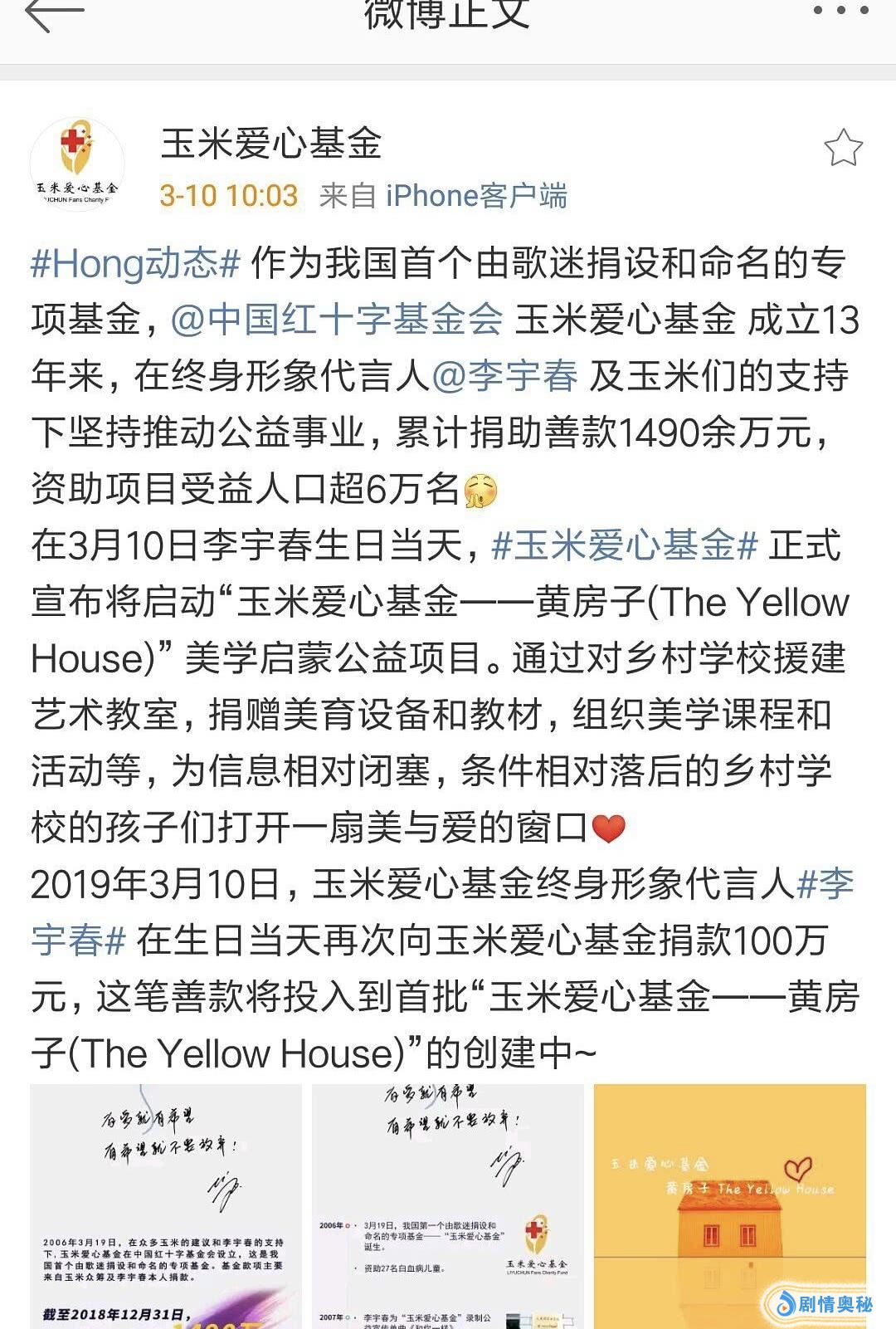 这已经形成了李宇春粉丝之间的优良传统了吧?当然了,李宇春自己也起到了表率作用。在李宇春生日这一天,玉米爱心基金宣布将启动“黄房子” 儿童美学启蒙公益项目,对乡村学校援建艺术教室、捐赠美育设备和教材、组织美学课程和活动等,她本人也在生日当天向玉米爱心基金捐款100万。这个玉米爱心基金已经成立了十三年,据统计,累计捐助善款1490余万元,资助项目受益人口超6万名。