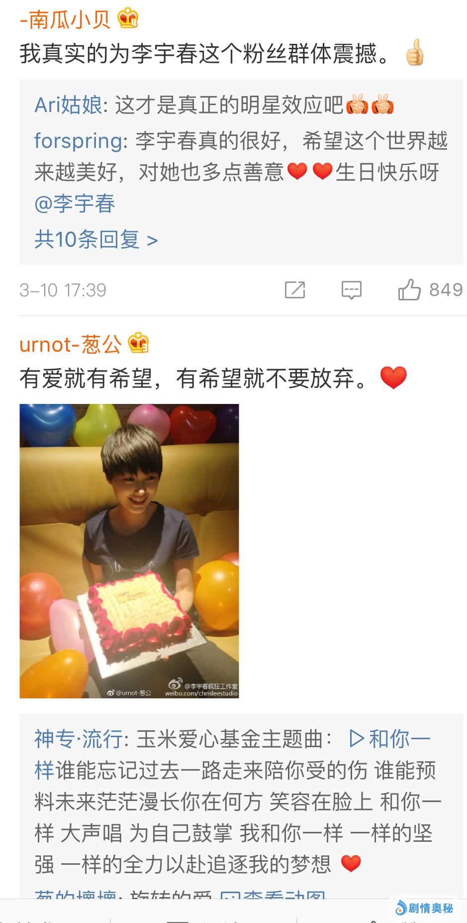 一般的明星过生日,我们最后的关注点都在谁谁谁给她送祝福了,也根据这个来判断娱乐圈艺人之间的关系。但是,到了李宇春这里就画风突变了,而且常年都是这种状态。李宇春的微博评论下面都是清一色的一句祝福加上每个人做慈善做公益的截图?这是什么画风?这是什么感人肺腑的画风?李宇春这个偶像当的也太成功了吧?这种粉丝真的不多了,应该说是仅此一家,因为他们家每一次有什么事情的时候就开始做慈善做公益。