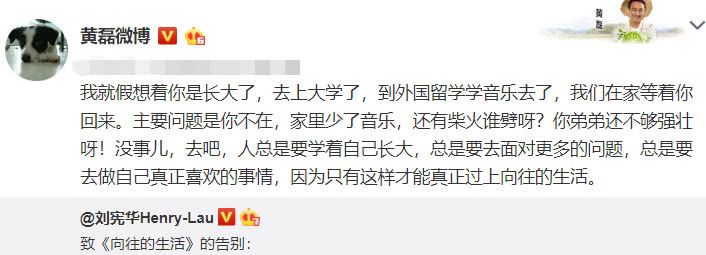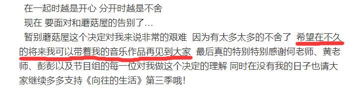 在刘宪华自己发的微博长文中,有表达自己对节目组的不舍得,其中的离开原因他也有向粉丝交代清楚。刘宪华说:“希望在不久的将来我可以带着我的音乐作品再见到大家“。原来刘宪华确定离开《向往3》是因为自己要创作出更好的音乐。对于这一点,相信他的粉丝也能够理解,毕竟刘宪华实在伯克利音乐学院读书,对于各种乐器也精通,对于音乐上的创作他定然也不会放弃。所以大家也不要太失望,也很期待日后他能够回归《向往》吧!