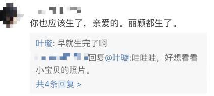 3月9日晚,有粉丝在叶璇微博下留言称:你也该生了,亲爱的,丽颖都生了。3月10叶璇回应网友:早就生完了啊。她的回应被网友热议,疑似她生子的传闻由她这么一引导,网上出现了大片言论。