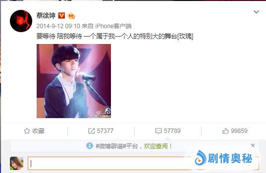 在2014年的某一天,坤坤有感而发“要等待,陪我等待,一个属于我的更大的舞台!”,当时这条微博发表出来的时候,评论的人并不不多,虽然显示的评论数量有五万多,但基本上都是最近才评论的。