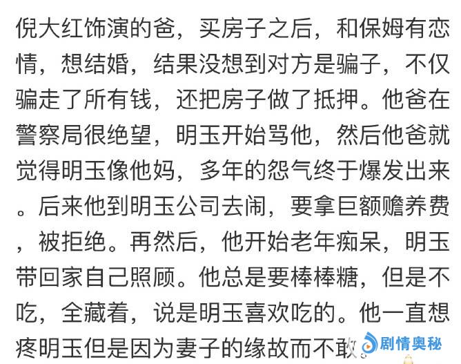 苏大强他窝囊了一辈子,老了还不忘坑子女们,作天作地,最终被保姆给骗婚了,骗光了 所有的钱财,苏明玉当着警察的面大骂苏大强,苏大强被气炸了,最后得了老年痴呆,明玉扛起了赡养他的责任。