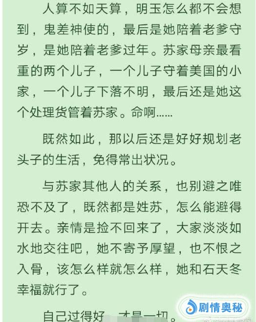 在小说里面,苏明玉的结局是完美的,她虽然经历了很多糟心的事情,但是,她遇上了石天冬,给她的生命里带来了很多温暖,融化了她的心,让她找到属于自己的幸福,而苏大强最终也受到了报应,他遭遇骗婚,被刺激的老年痴呆了,两个儿子不管他,只有明玉赡养他。