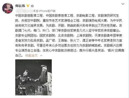 而最近,何沄伟再度发文,认为京剧不需要外行来振兴,而此举也是在影射郭德纲唱京剧,众所周知,郭德纲喜欢京剧,去年也曾多次登台演出,年初时在上海兰心大剧院连演两天,为观众带来麒派的《四郎探母》和折子戏《失印救火》、《徐策跑城》、《打严嵩》等经典曲目。也有现场观众喊出:振兴京剧要靠郭德纲了,而现场郭德纲也表示:“别别别,不敢当不敢当,我就是跟着起哄的”。没想到距离上次演出三个月之后,何沄伟会发出如此评论,看来是要打脸郭德纲。