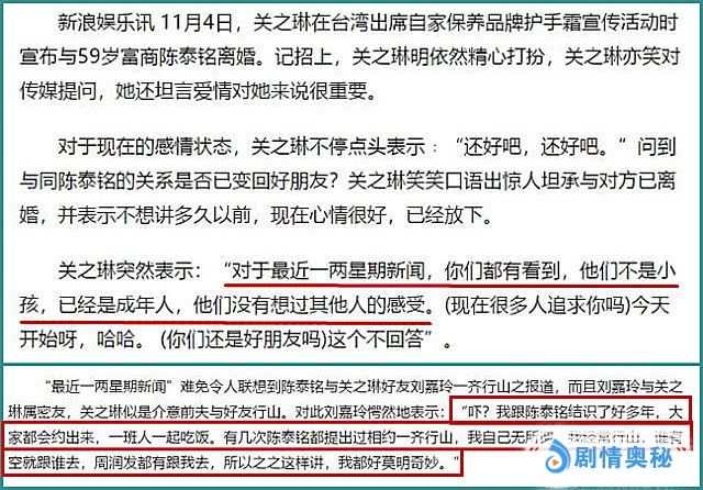 关之琳和前夫离婚后,在某次接受采访时,语言暗指陈泰铭和刘嘉玲不考虑他人感受,将离婚的矛头指向了刘嘉玲,虽然关之琳没有明确表示暗讽为哪般,但刘嘉玲却站出来直接回应,称自己和陈泰铭只是多年好友,表示自己有行山的习惯,曾和多位好友相约爬山,称连周润发也一起爬过。