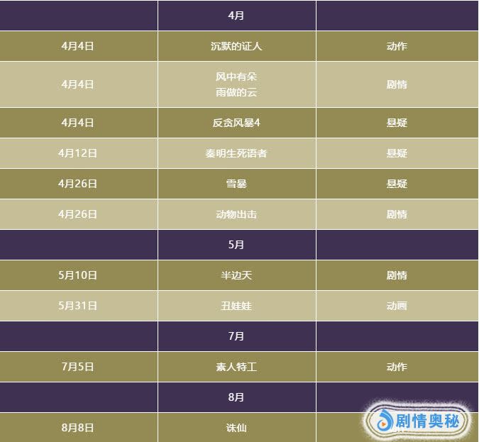 上周定档的影片有:《半边天》《雪暴》《地久天长》《反贪风暴4》。《动物出击》改档4月26日。