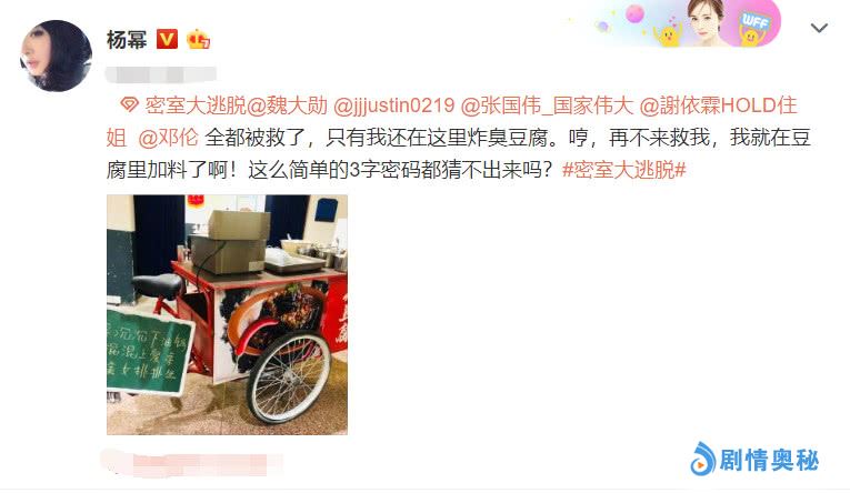 在这则微博里,杨幂的语气也是慢慢的少女感:“全都被救了,只有我还在炸臭豆腐!哼,再不来救我我就在豆腐里加料了啊。”并标上的密室大逃脱的字眼。杨幂活泼调皮的风格又回来了,语气中也尽是满满的可爱,简直是逆龄生长。