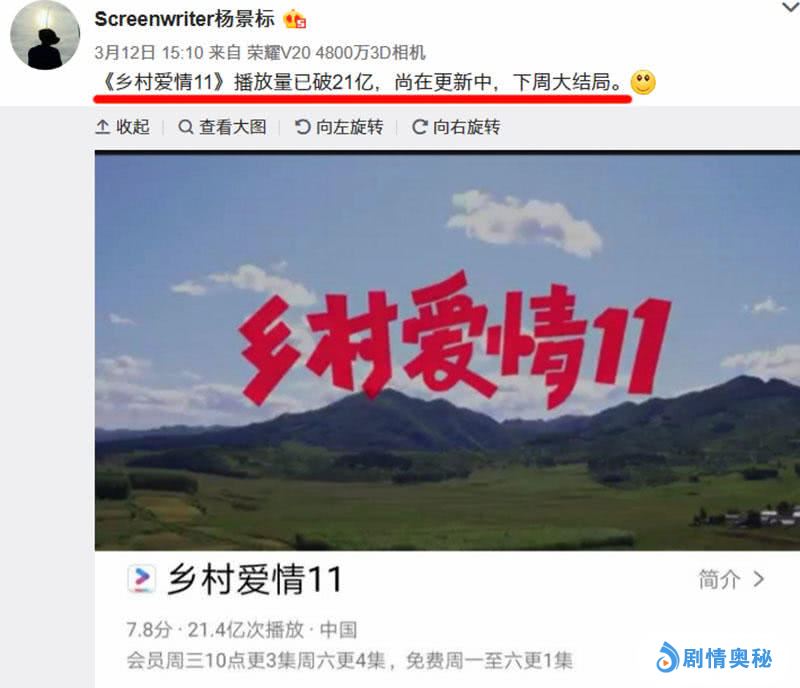 前不久,《乡村爱情11》编剧之一杨景标在个人媒体发文,称该剧在网络独播平台播放量已破21亿,而且还在更新中,预计下周大结局。大家都知道,从今年年初开始,很多网络平台都取消了前台数据显示,称其为了防止不正当竞争,而杨景标的这张数据图,可能是来自后台的统计结果。