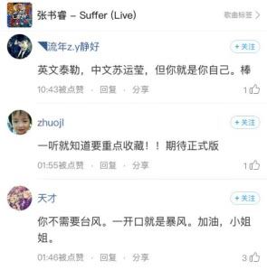 作为导师的“原创捕手”让人惊艳,选手们的实力更是不容小觑!比如吉他小姐姐张书睿,一首美式田园风格的中英双语单曲《Suffer》就让酷狗网友刷爆好评~轻快悠扬的旋律搭配张书睿清新磁性的声线,英文部分像泰勒·斯威夫特,中文又像苏运莹,令网友大呼:你不需要台风,一开口就是暴风!