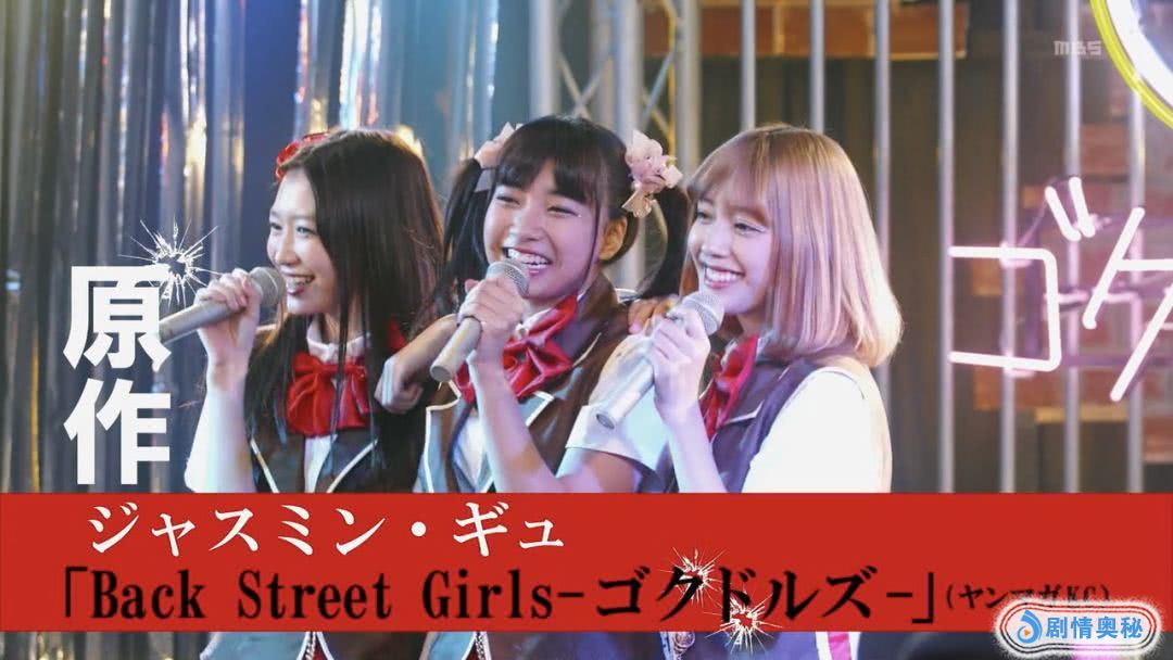 电视剧版的“后街女孩”由日本特摄剧三大女主冈本夏美、松田瑠华、坂之上茜饰演。三人不仅在外形上贴合原著,演技也值得称赞,虽然长相甜美可爱,但是演起中年大叔,完全没有偶像包袱。不管是黑道含胸溜肩的二八步,还是在路边喝酒抽烟的沧桑感,都拿捏得十分到位,完全没有违和感。出道前表演时,三人美少女的脸庞配上糙汉子粗狂的歌声,画面极具冲击力,简直不忍直视。