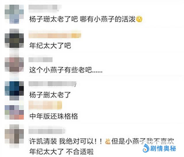 曝光的项目书中,两位女主演名单也赫然在列,杨子姗主演“小燕子”、文咏珊演“夏紫薇”,虽然杨子姗和文咏珊演技不错,气质也很让人欣赏,长相也属舒服自然,但年龄未免有些大了,两位30+的女性,有了岁月的沉淀,还能表现出十几岁的少女感吗。