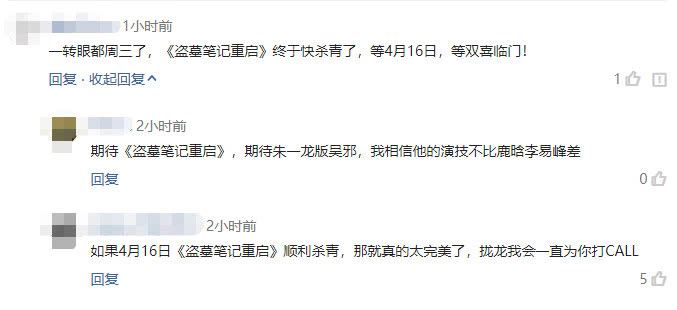 朱一龙新剧《盗墓笔记重启》即将杀青,粉丝期待4月16日的到来,有粉丝评论道:一转眼都周三了,《盗墓笔记重启》终于快杀青了,等4月16日,等双喜临门!有粉丝评论道:期待《盗墓笔记重启》,期待朱一龙版吴邪,我相信他的演技不比鹿晗李易峰差!还有粉丝评论道:如果4月16日《盗墓笔记重启》顺利杀青,那就真的太完美了,拢龙我会一直为你打CALL!