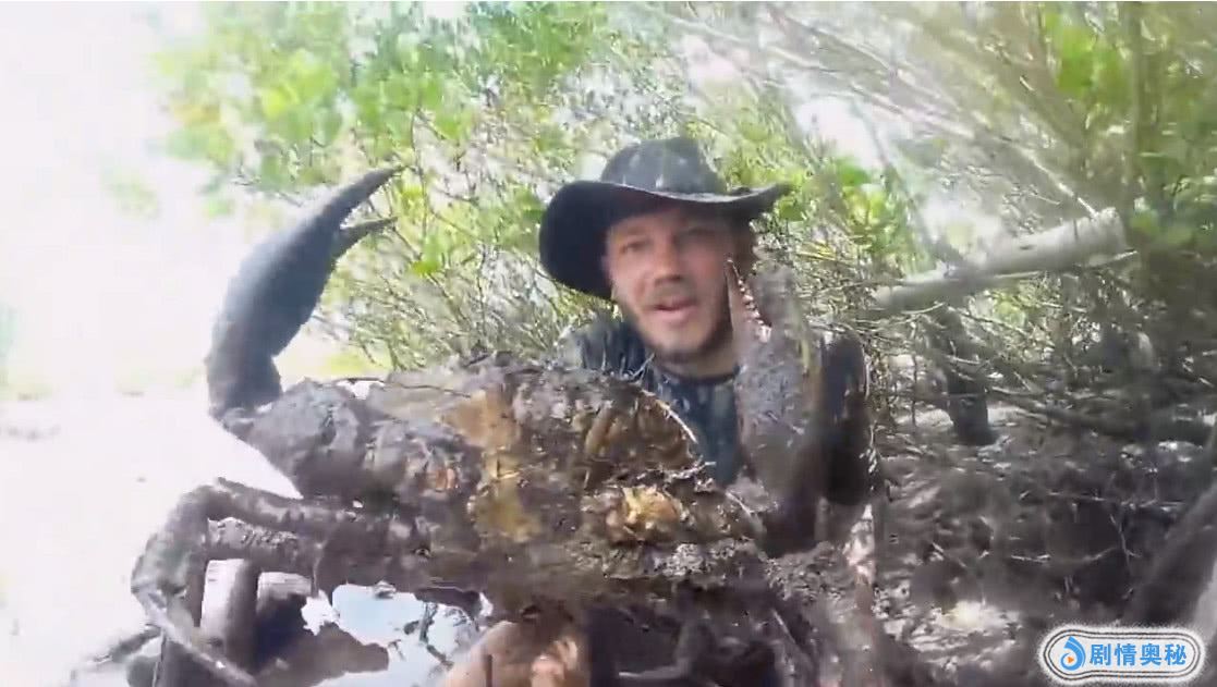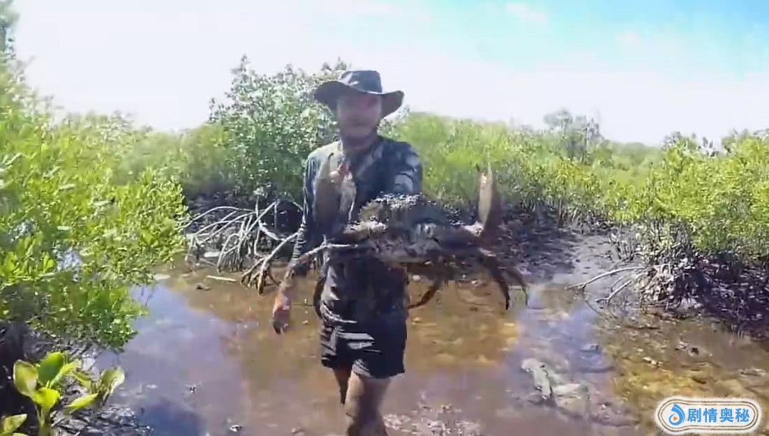 光伸手还不够,他甚至把半个身子都伸进了洞穴里。从第三视角看,之后一双腿搂在外面,还真是艺高人胆大啊。不一会,他就从洞穴里抓出了一只超大的螃蟹。之间男子举起螃蟹,跟自己的脸做对比,螃蟹的甚至有他的头那么大。