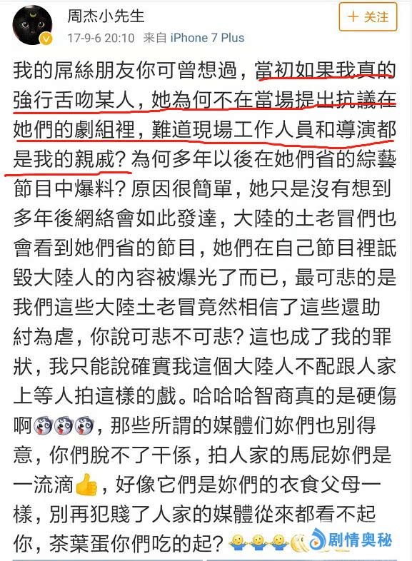 而就在3月13日,周杰最新受访的节目《立场》在网络上播出,他再一次谈及并回应了那次风波。周杰对那件事的看法依旧没变,说辞似乎换了一套。周杰认为,他之所以会发文解释此事,目的并不是要专门针对某个人,目的只有一个:那就是希望扭转某些网友看待问题的方式和角度,要有基本的逻辑思维能力,不要盲目跟风。