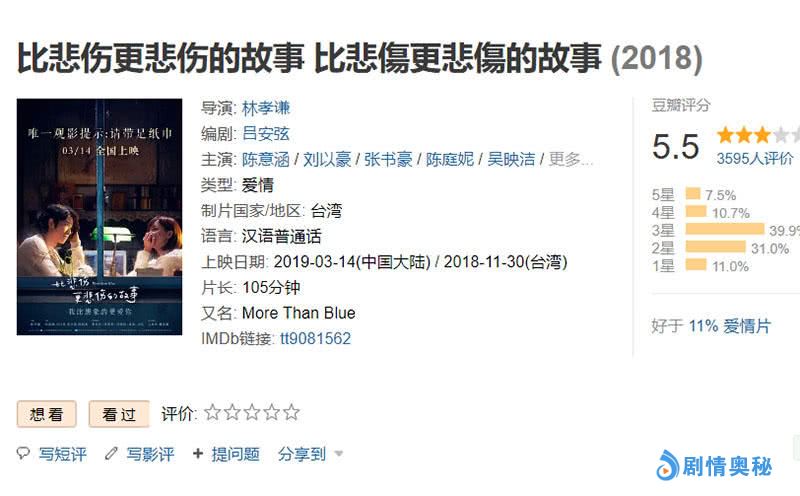 但从豆瓣网的评分来看,《比悲伤更悲伤的故事》仅5.5分,一星占比率达到了11%,这是一个不及格的成绩。虽然票房不错,但因为该片去年在台湾就上映了,有一部分观众已经看过,也给出了中肯的评价,之所以口碑扑街,主要还是3个硬伤让观众无法接受。