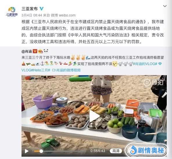 近日,肖涵还因为一条微博,引发了网友的热议。一开始,肖涵只是在微博上晒出自己拍戏之余在三亚度假的悠闲日子,还配了一段在海滩上烧烤的小视频。没想到,这条微博却被三亚发布转发了,称三亚建成区内禁止露天烧烤行为,违法进行露天烧烤食品或为露天烧烤食品提供场地的,会根据相关规定,处五百元以上二万元一下的罚款。