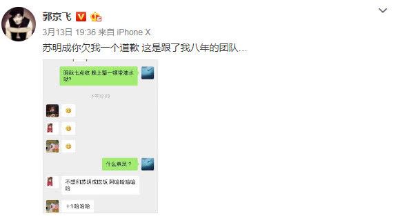 近日,又有一件事情吸引了大家的注意。那就是郭京飞发文表示他在群里和跟了自己八年的团队成员提议聚餐,但是没想到,大家都很冷漠,有一个人说出心声:“不想和苏明成吃饭!郭京飞哭笑不得,要求苏明成道歉。