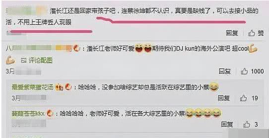 在节目结束后,很多蔡徐坤的粉丝纷纷跑的潘长江老师的微博下面留言,让他回家看孩子;连蔡徐坤都不认识,上什么《王牌对王牌》,缺钱了就去演演小品吧!对于这样的网友,小编只想说:请尊重他人,尊重给我们制造快乐的老先生。