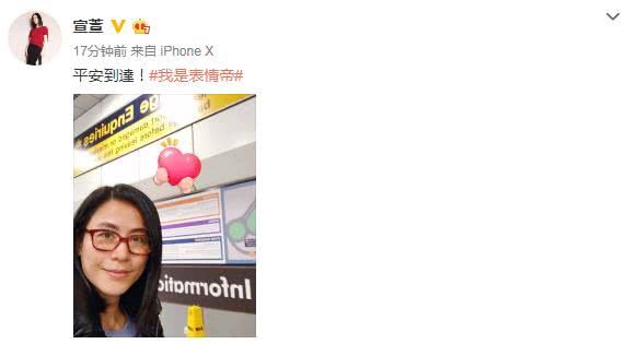 今日(3月14日),到英国拍戏的香港女演员宣萱,为让粉丝放心顺利到达后也在微博晒出一张自拍,并附文报平安:“顺利到达!”最后还不忘附上一个“我是表情帝”的标签。
