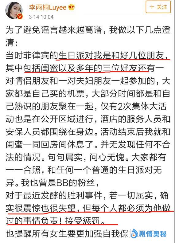 李雨桐在微博中表示,当时去菲律宾参加生日派对并不是自己一人前往,同行的还有好几位朋友以及自己的闺蜜。另外,去菲律宾的机票也并没有像网传的那样是由李胜利全款买单,而是自己掏钱去的。至于和李胜利的合影,除了她自己,其他人也都有一一跟胜利合照。